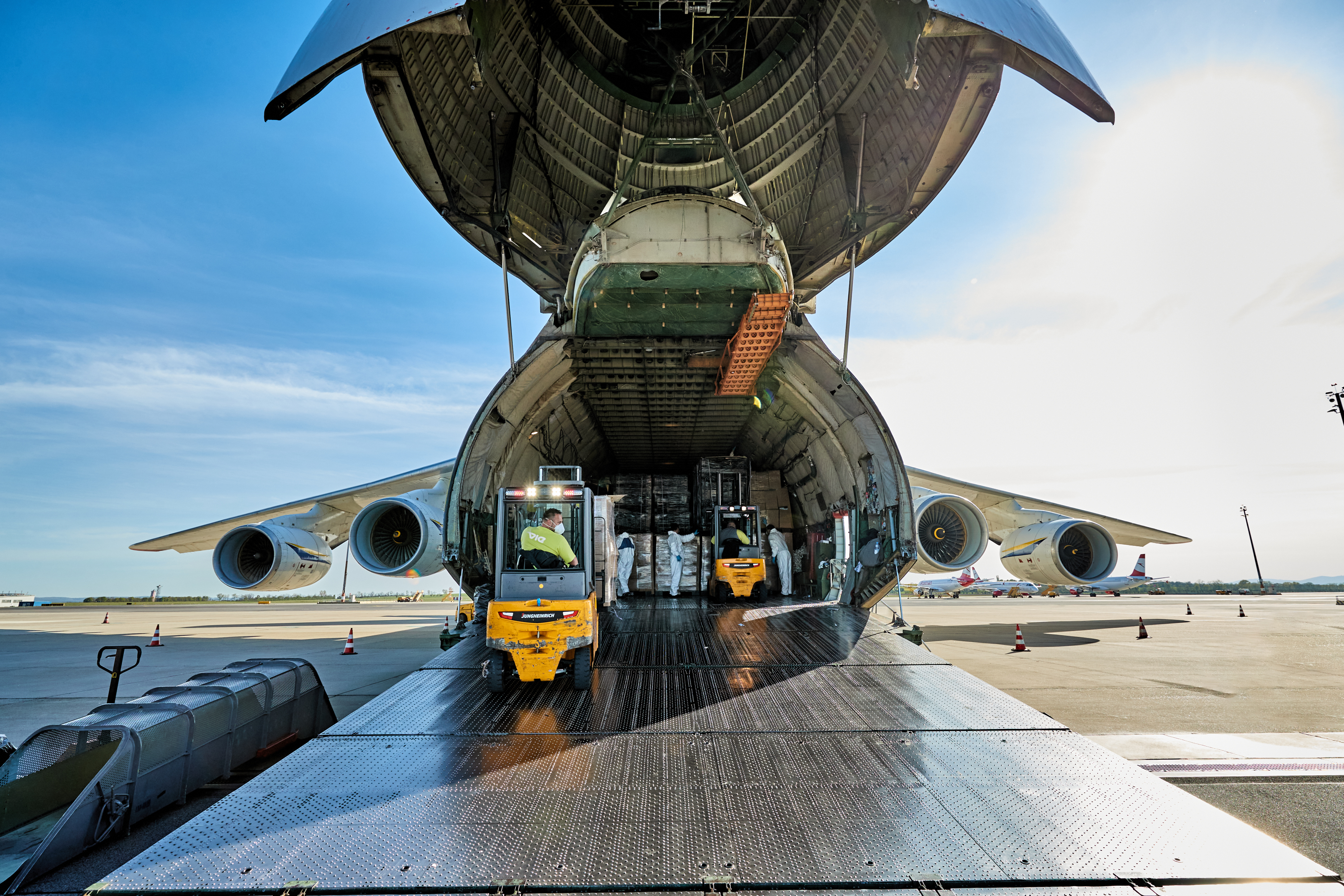 Foto: In April, two Jungheinrich forklifts unload an Antonov 124 loaded with protective masks and other medical supplies. Fotocredit: ANDREAS HOFER / Jungheinrich