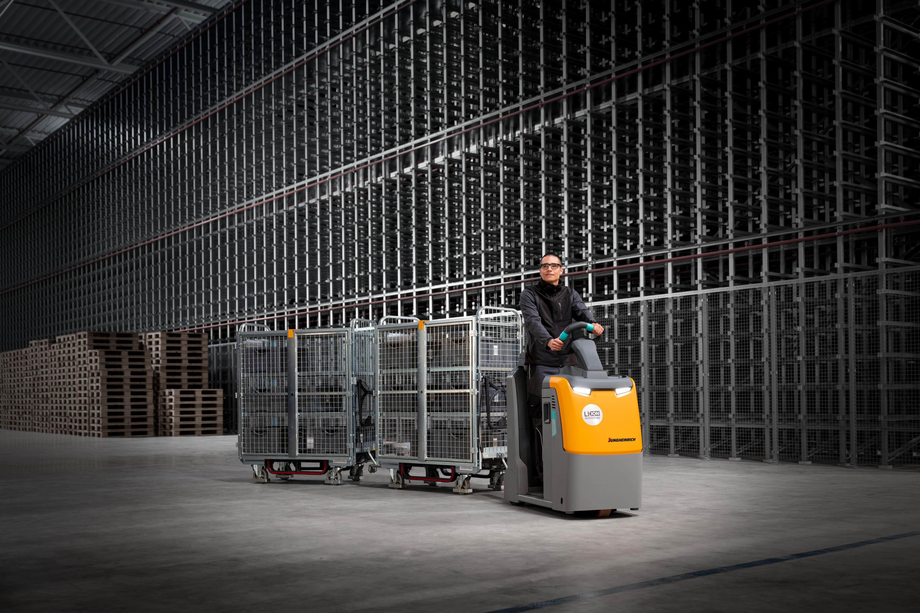 The design of the truck made it possible to enlarge the boarding area for the tow tractor by 70 mm without changing the basic measurements of the truck. The new low standing platform makes it possible to get on and off the truck comfortably and safely with minimal effort. The frame of EZS 130 is made from high-quality steel plate and now comes with an arched chassis apron at the front cover. Depending on the type of use and customer requests, there are various types of backrests (including integrated seating possibilities) to choose from in order to relieve the strain on the legs during long periods of use. The height-adjustable folding seat, for example, ensures greater driving comfort, especially on long journeys, thus making work less tiring. The electric steering is carried out through the vertically adjustable Jungheinrich jetPILOT. The new construction further optimises the lowest adjustment range for shorter drivers, which guarantees fatigue-proof work.